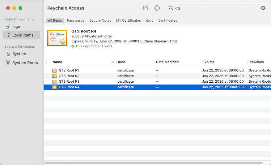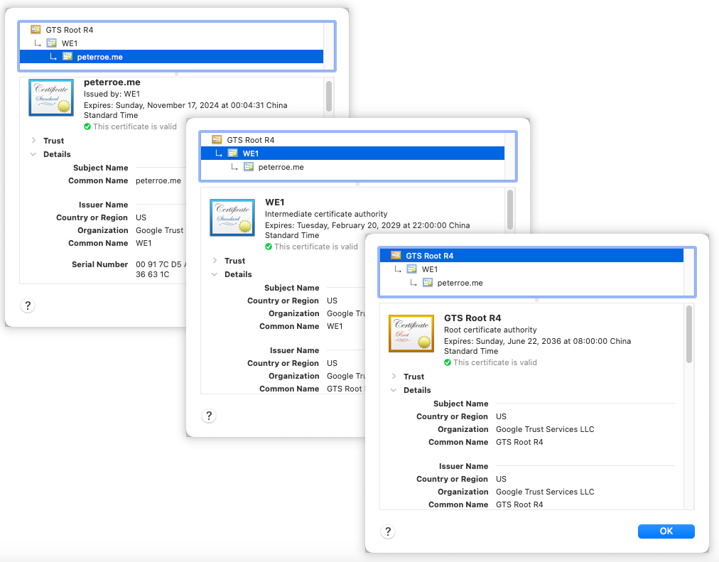 下面是当前网站(https://dev.peterroe.me)的证书链校验过程,浏览器会逐级向上校验每个证书的数字签名,直到根 CA 为止